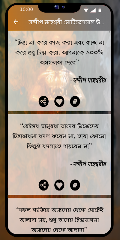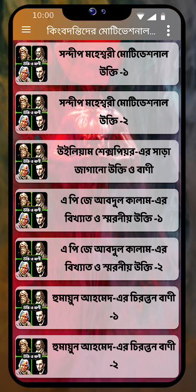 সেই সকল কিংবদন্তিদের অনৃপ্রেরণা মূলক উক্তি ও বাংলা বানী গুলো মানুষের জীবনে হতাশা দূর করতে সাহায্য করবে। এই App- এর উক্তি বা বাণী গুলো বিখ্যাত ব্যক্তি ও মনিষিদের জীবনী থেকে সংগ্রহ করা হয়েছে।
