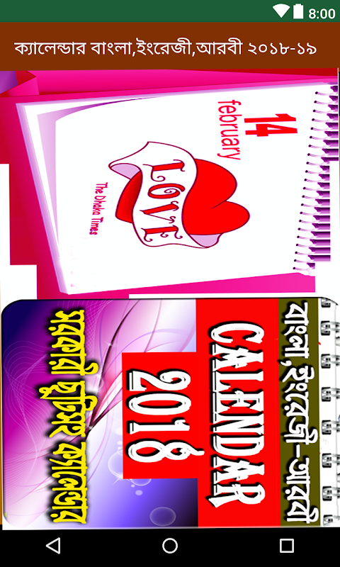 এই ইংরেজি ২০১৮ সালের ক্যালেন্ডার Application এর ভিতরে রয়েছে বাংলা ও আরবি বছর। সাথে বাংলাদেশের সরকারি ছুটির দিনগুলিও এতে দেয়া হয়েছে। আলাদা আলাদা করে বাংলা ক্যালেন্ডার app এবং আরবি ক্যালেন্ডার app আপনার মোবাইলে রাখতে হবেনা।