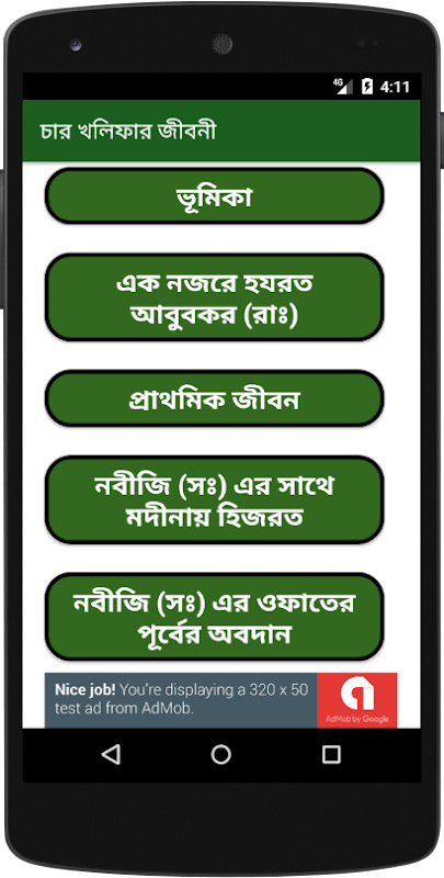 এই এপ্লিকেশানের মাধ্যমে ইসলামের চারজন খলিফার জীবনী সম্পর্কে বিস্তারিত তুলে ধরা হয়েছে।