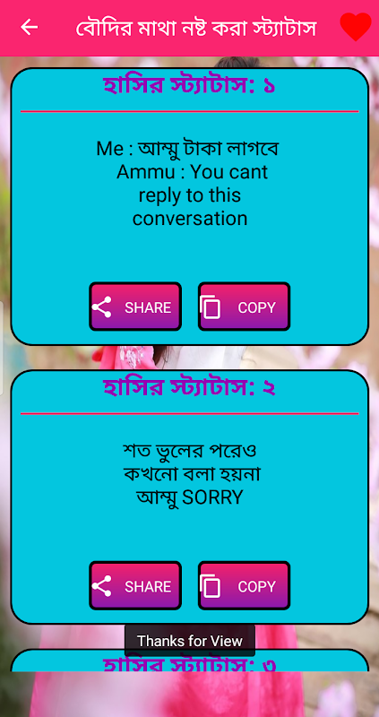 এই অ্যাপসটিতে যে সব হাসির জোকস স্ট্যাটাস আছে তা অপনি বন্দুদের সাথে ১ কিল্কে কপি এবং শেয়ার করতে পারবেন ।