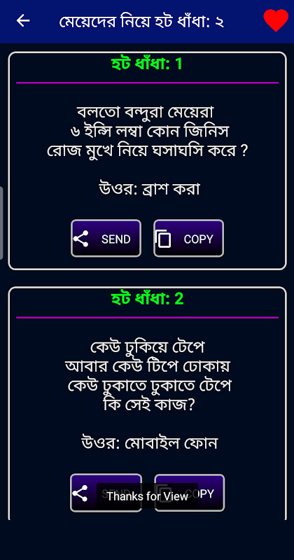 এই অ্যাপ এ আমরা চেষ্টা করেছি এমন সব মজার ধাঁধা ও স্ট্যাটাস লিস্ট করতে যা আপনার অনেক ভালো লাগবে এবং অবসর সময় টা মজা করে কাটাতে পারেন ।
