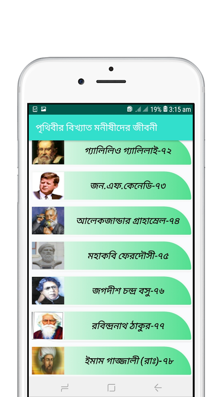 এই বিখ্যাত মনীষীদের জীবনী অ্যাপ থেকে জানতে পারবেন সর্বকালের সেরা বিখ্যাত ১০০ মনীষীর জীবনী ও ইতিহাস। পৃথিবীর ইতিহাসে বিভিন্ন মনীষীদের জীবনী বিস্তারিত পাওয়া খুবই কঠিন। মনিষীদের মধ্যে রয়েছে বিভিন্ন ধর্মানুসারী ও মুসলিম মনীষীদের জীবনী। হাজারও ব্যাকতির মাঝে শত মনীষীর জীবনী একটি কালজয়ী বই বা অ্যাপ। আশাকরি আপনাদের আনন্দ দানে খুবই কার্যকরী হবে এই ১০০ মনীষীর জীবনী নামক অ্যাপটি। আমাদের এই ১০০ বিখ্যাত মনীষীর জীবনী অ্যাপটি ভাল লাগলে সকলের সাথে শেয়ার করুন আর রেটিং দিয়ে ১০০ বিখ্যাত মনীষীদের জীবনী অ্যাপটিকে বিখ্যাত করে তুলুন।