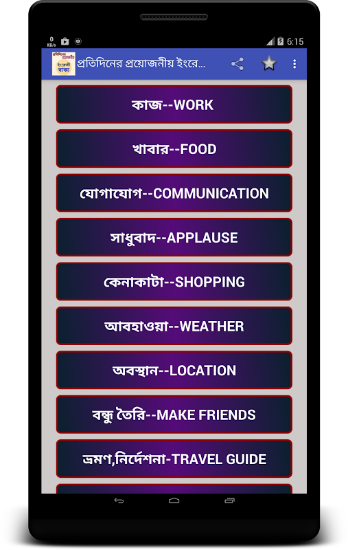 বাংলা থেকে ইংরেজিতে অনুবাদ~english to bangla anubad এই অ্যাপসটি মুলোত ইংরেজী শেখার কোর্স বা ইংরেজি শেখার বই , যেখানে বাংলা থেকে ইংরেজি অনুবাদ ও ইংরেজি থেকে বাংলা অনুবাদ এর মাধ্যমে ইংরেজি ভাষা শিক্ষার সহজ পাঠ তৈরী করা হয়েছে। আরও রয়েছে প্রতিদিনের প্রয়োজনীয় ইংরেজী বাক্য, প্রতিদিনের প্রয়োজনীয় ইংরেজী শব্দ, Vocabulary