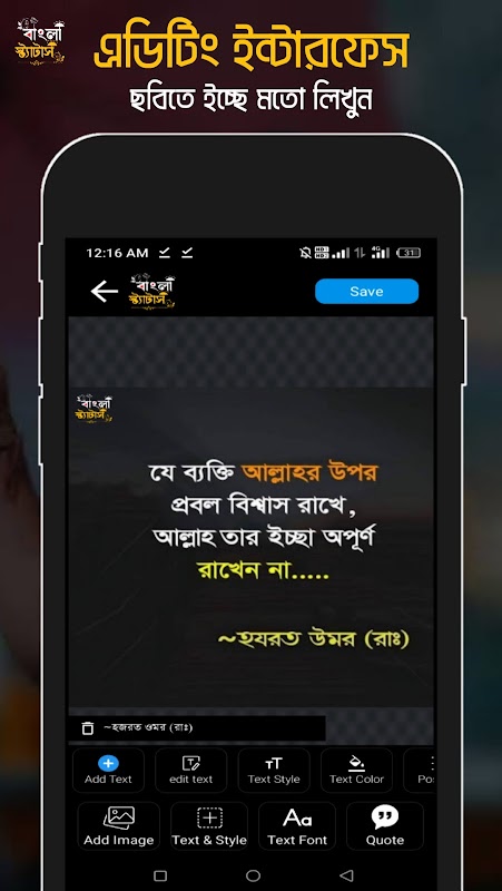 Bangla Status & Bangla Photo Caption-app heeft veel bewerkingstools. Bangla Status Photo Caption kan stijlvol worden ontworpen zoals u wilt en het bijschrift kan worden opgeslagen. Photo Caption kan worden gedownload. Bangla Status & Photo Caption App heeft een onbeperkte statusfoto-bijschriftcategorie.
