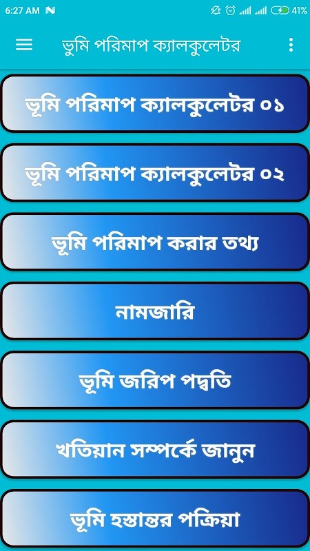 ভুমি পরিমাপ ক্যালকুলেটর অ্যাপ বাংলা ভাষায় তৈরী জমি পরিমাপের একটি অনন্য অ্যাপ। যেখানে সাধারণ মানুষ খুব সহজে যেকোন জমির হিসাব করতে পারবে,এখানে দুটি ক্যালকুলেটর দেওয়া হয়েছে।একটি সহজে যে কেউ হিসাব করতে পারবে।আর একটি যারা চিত্র এর মাধ্যমেঃ ত্রিভুজ,চতুর্ভুজ,বৃত্ত আকারে জমি পরিমাপ করতে পারেব।