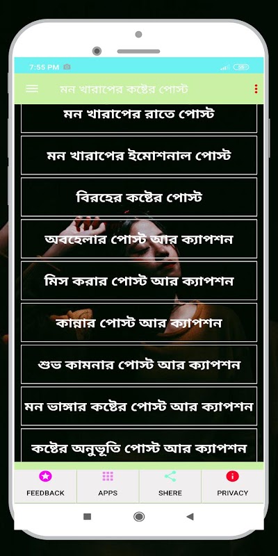 এই অ্যাপসটি থেকে মন খারাপের কষ্টের পোস্ট, স্ট্যাটাস আর ক্যাপশন পাবেন।