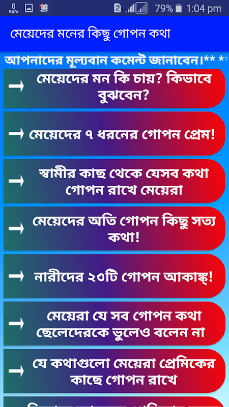 মেয়েদের অজানা কিছু গোপন কথা আমাদের অ্যাপটির মাধ্যমে আপনারা জানতে পারবেন। আপনার স্ত্রী কিংবা প্রেমিকার মনের কথা জানতে হলে আজই আমাদের অ্যাপটি ডাউনলোড করুন।
