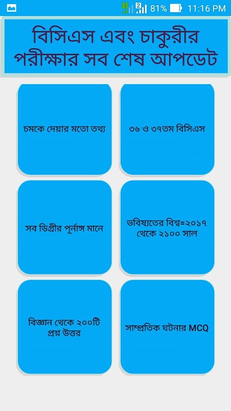 বিসিএস এবং চাকুরীর পরীক্ষার সব শেষ আপডেট পেতে এই আপসটি আপনাদের অনেক সহায়ক হবে বলে আশা করছি।চাকরির প্রস্তুতি তে কার্যকরী বিসিএস প্রস্তুতি(bcs), ব্যাংক জব(bank job),সরকারী চাকরি(government jobs) সহ সব ধরনের চাকরির পরীক্ষার জন্য বিসিএস এবং চাকুরীর পরীক্ষার সব শেষ আপডেট দিয়ে সাজানো এই অ্যাপটি।