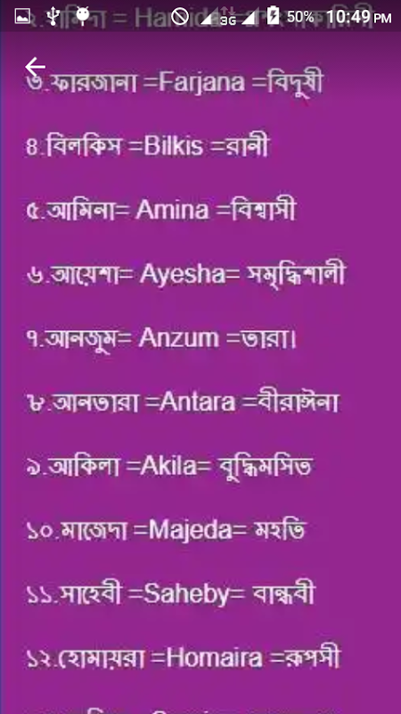 আর সবগুলো নামের বাংলা এবং ইংরেজী অর্থসহ বাংলা নামগুলো সাজানো হয়েছে।
