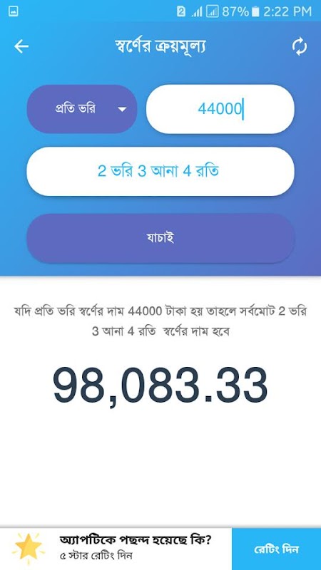 স্বর্ণ খাঁটি তো is een van de beste hulpprogramma-apps in de Play Store om goudgewicht om te rekenen, de goudkwaliteit te controleren, de koop- en verkoopprijs van goud te berekenen. Hiermee kunt u ook het gewicht van goud omrekenen.