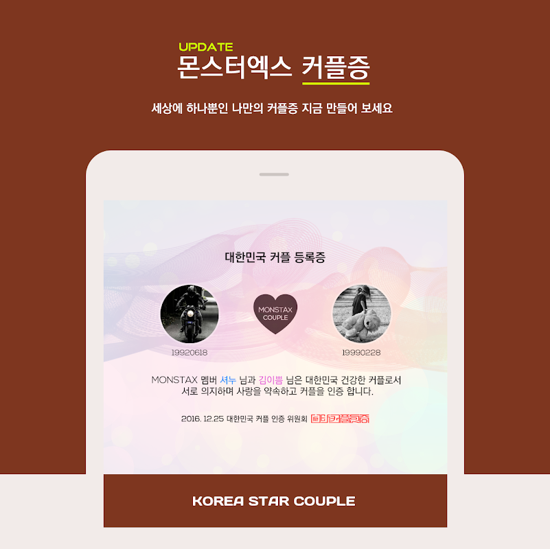 매니아 팬덤 이라면 누구나 꿈꾸는 나만의 스타와 커플증을 만드는 앱으로 좋아하는 몬스타 엑스 멤버를 선택하여 가상의 커플증을 만들어 보세요.
