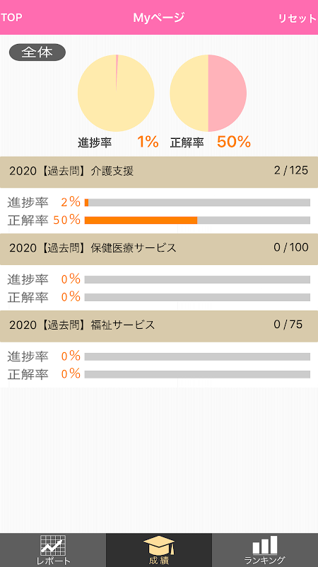 分野別に学習進捗率・正誤数を確認!さらに、ユーザー内の自分のランキングや学習記録を確認することで、毎日の学習管理も行うことができます。