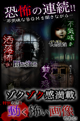 ◎怪談話や恐ろしい話は全て実録(ほん怖)!更に、超絶怖いGIF動画も収録!怖いBGM付きで雰囲気を演出!