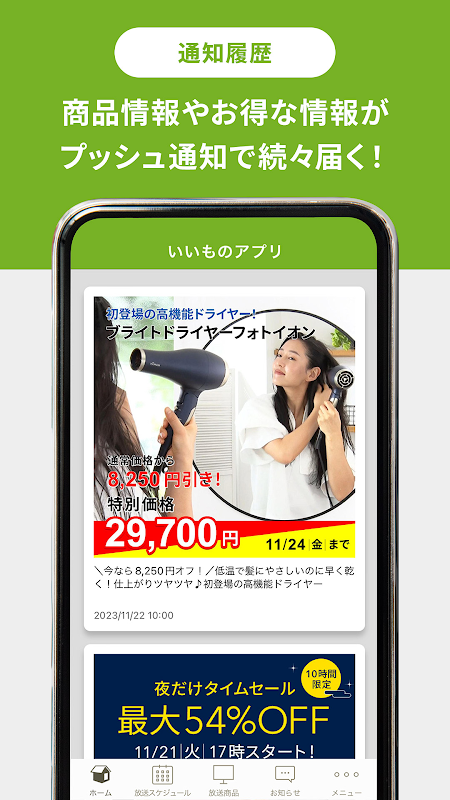 Biedt geweldige content zoals het uitzendschema van Iimono Premium, berichten van medewerkers over producten die in de show worden getoond, kortingsbonnen en meer.
