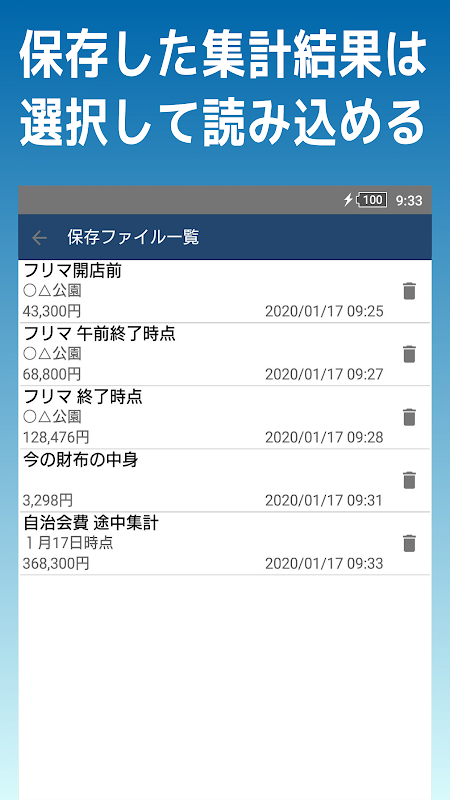 1円~10,000円の硬貨・紙幣の枚数を入力すると合計金額を計算するアプリです。 計算結果は、タイトルとメモを付けて保存できます。