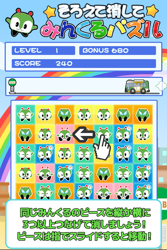 東京都の都バス人気マスコットキャラクターみんくるがパズルゲームになって登場!スマホでいつでもみんくるゲームが遊べるよ!みんくるを揃えて消して高得点を目指そう!