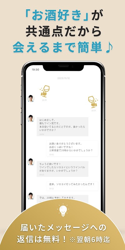 ■ [Neem af en toe iemand mee] Drink alleen met iemand met wie u goed overweg kunt. Zelfs als u gewend bent om alleen te drinken, zijn er ongetwijfeld avonden waarop u met iemand wilt praten. Als dat gebeurt, tweet dan gewoon "Wil je vanavond wat gaan drinken?" in de app. Misschien geniet je wel van een heerlijk drankje één op één met iemand die in dezelfde buurt zit of dezelfde interesses heeft. *Maak je geen zorgen, als je wat tijd alleen wilt doorbrengen, kun je je profiel verbergen voor andere gebruikers.