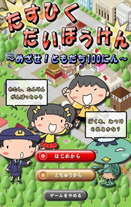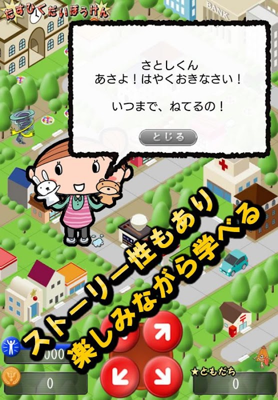 町を散策しながら、謎を解いたり、人を探したり、時には事件に出くわして、犯人を捕まえたりと、冒険しながら、足し算・引き算を反復練習するアプリ。