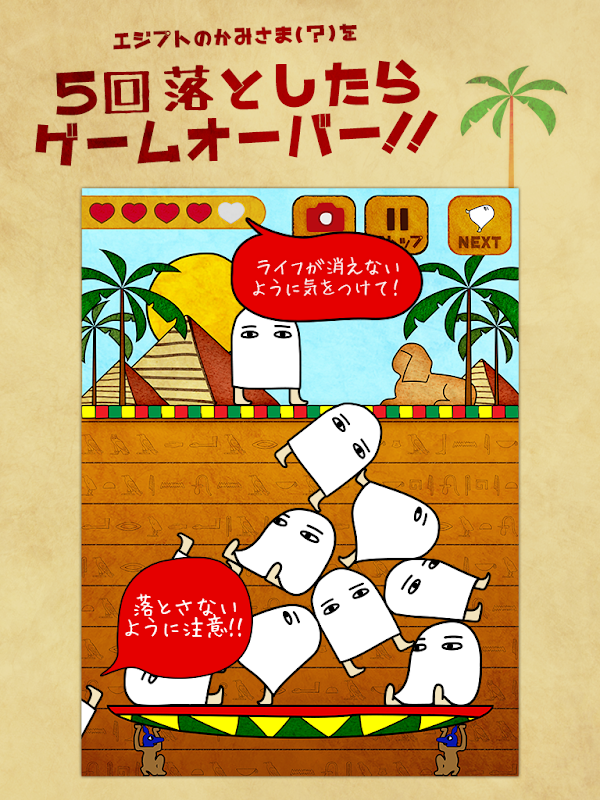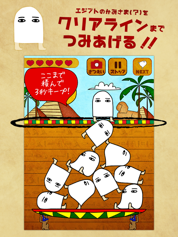 画面上部に現れるいろんなポーズの「メジェドさん」を、クリアラインまで積みあげよう。