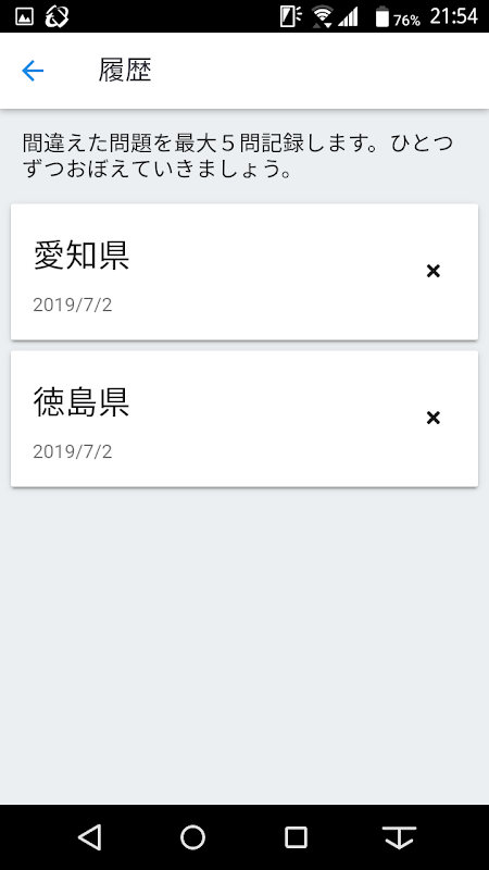 ・間違えた県名を記録します。集中的におぼえるのに役立ちます。