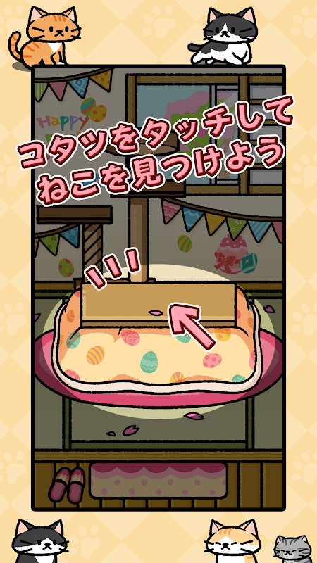 コタツに集まる猫たちを、めくって見つけてコレクションしよう! 時間をおいてから訪れれば新しい猫に出会えるかも? せわしくない、のんびりゆったり推奨の猫アプリ。