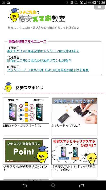 格安スマホ・格安SIMについての疑問や基礎知識などをひよこ先生と一緒に学べるアプリです。