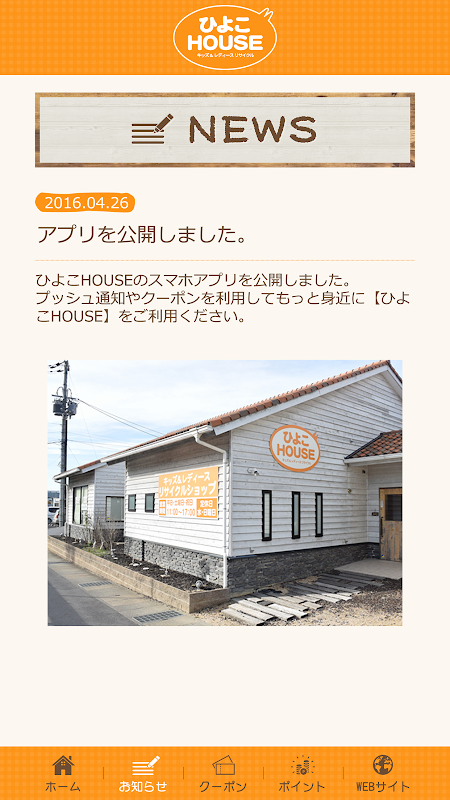このアプリでは、【ひよこHOUSE】で使えるお得なクーポンの配信やお店の新着情報、青空市開催のお知らせ、SALEのお知らせなど、最新情報をいち早くお届けします。