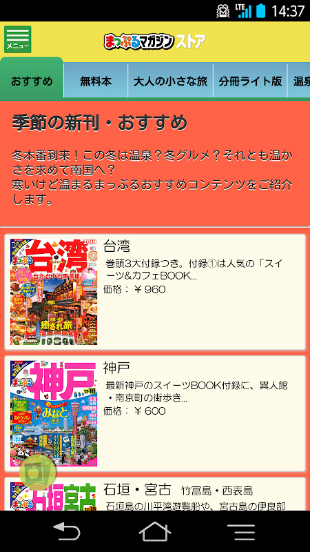 「遊ぶ」「食べる」「買う」「見る」「泊まる」のおすすめ情報をぎっしり収録した、ガイドブックの大定番『まっぷるマガジン』の電子書籍アプリです。