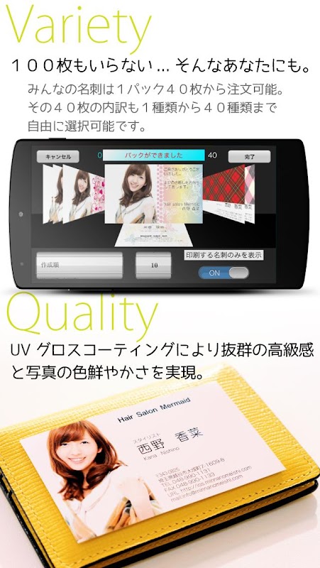 みんなの名刺ーフルカラー名刺&カード印刷サービス<写真入りの名刺がアプリで簡単作成&すぐ発注><1セット40枚が送料込みで900円しかも40枚の組合せは自由!>