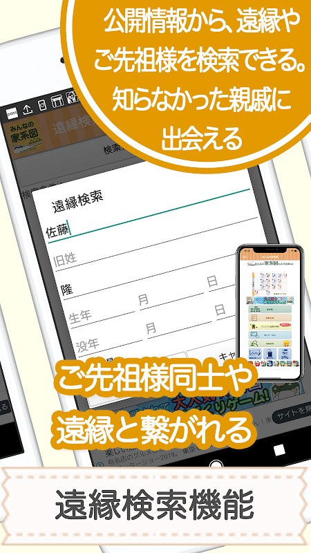 De enige in Japan! Omdat u een gemeenschappelijk ID voor de website kunt gebruiken, kunt u de stamboom die u met de app hebt gemaakt, zelfs op de webversie (pc) raadplegen en bewerken. Alle wijzigingen die u aanbrengt, worden onmiddellijk doorgevoerd.