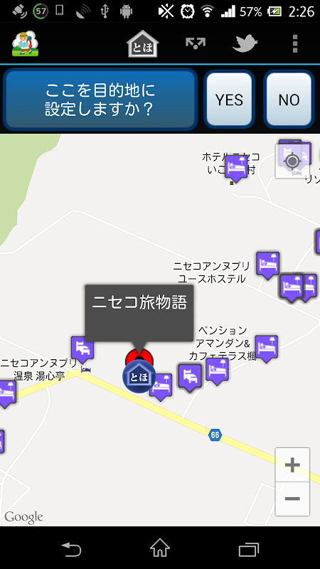 起動すると地図が表示されますので、旅の目的地を設定してください。