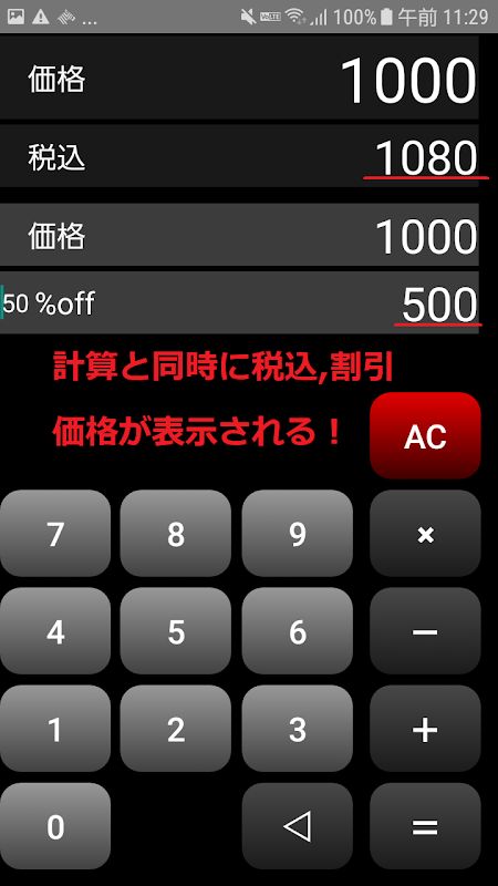 消費税電卓の決定版!入力と同時に税込、割引が「自動で表示される」らくらく消費税電卓!