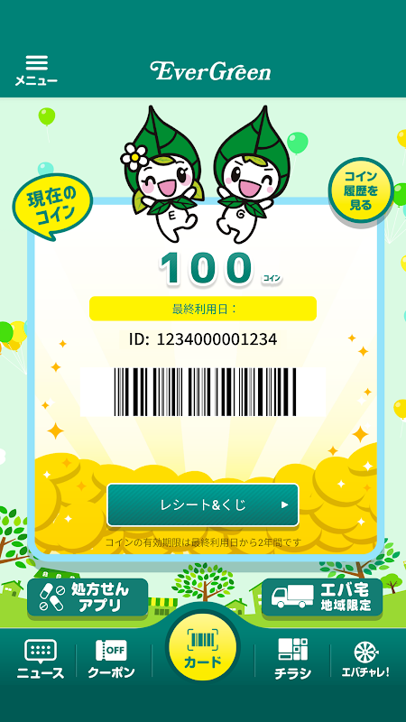 エバコイン、クーポン、チラシはもちろん、アプリ限定の「エバチャレ!」抽選も楽しめます。