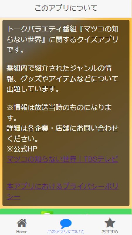 トークバラエティ番組『マツコの知らない世界』に関するクイズアプリです。番組内で紹介されたジャンルの情報、グッズやアイテムなどについて出題しています。