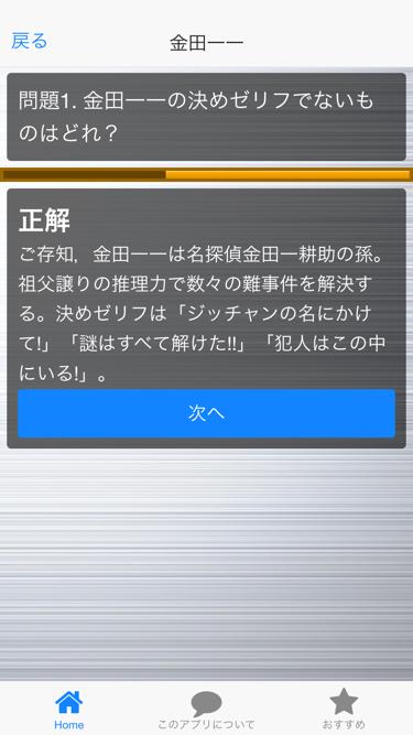 このアプリは「金田一少年の事件簿」が大好きな人のために,マニアックなクイズを出題している。この後も随時問題を追加していく予定なので,お楽しみに!