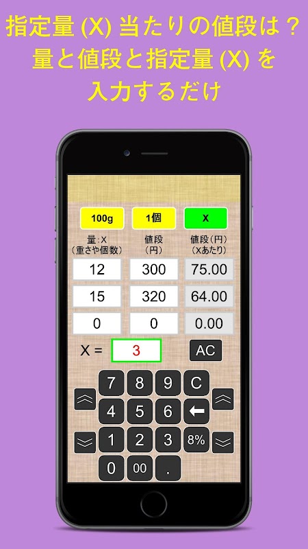 "Hoeveel gram?" Is een app die de prijs per 100 gram berekent. Wat is voordeliger als het 800 gram van 500 yen en 500 gram van 300 yen is? Kan worden berekend.