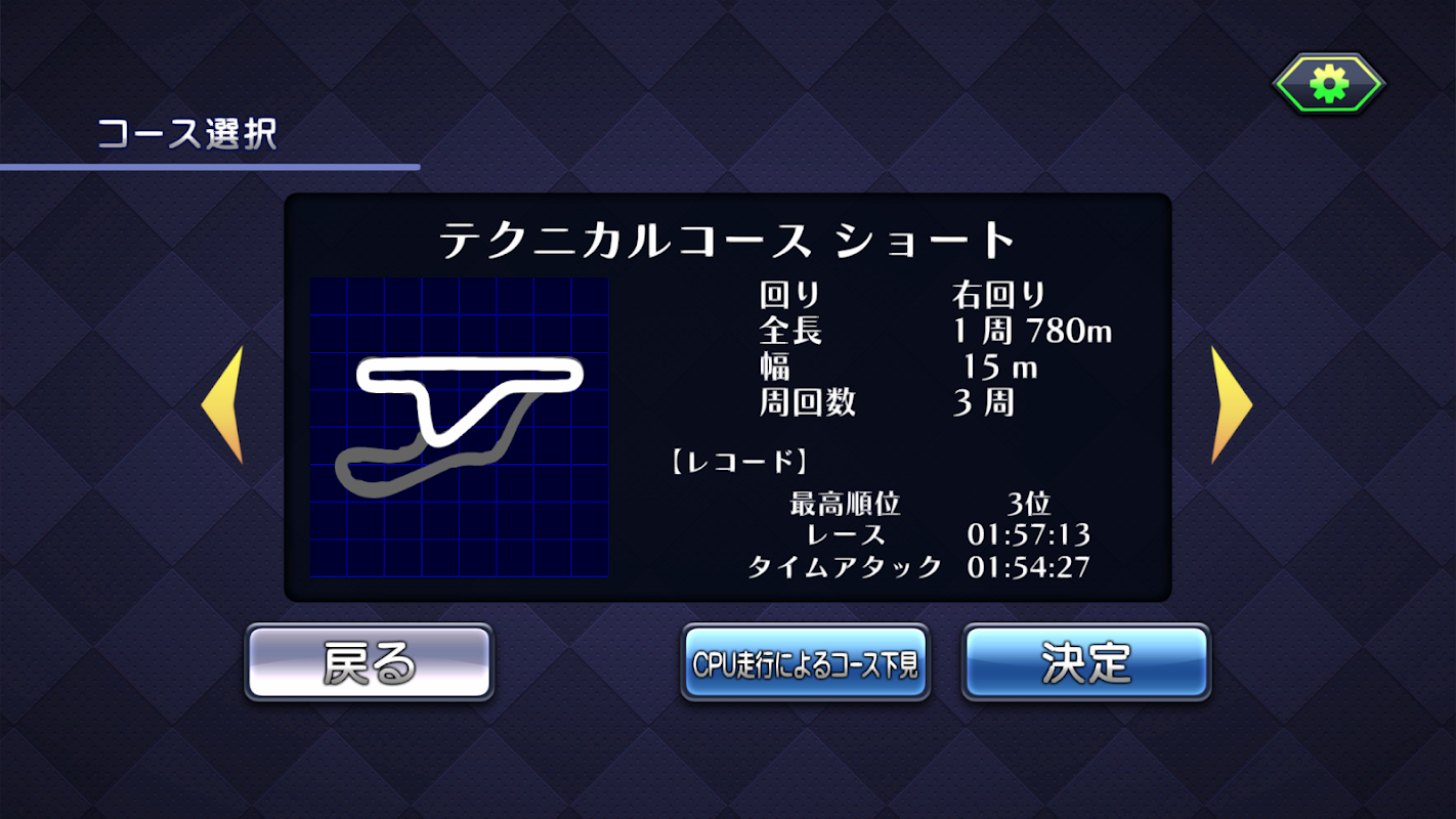 Als u "Cursusvoorbeeld door CPU-rijden" selecteert op het baanselectiescherm, kunt u het referentiespel van de baan met het geselecteerde automodel zien.