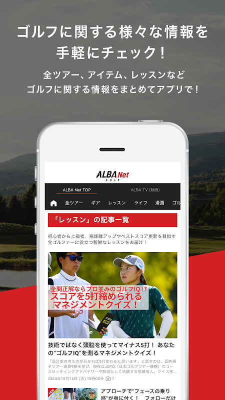 ALBA TV is vernieuwd als “ALBA Net”! De grootste uitgebreide golf-app van Japan! Naast video's bieden we een breed scala aan informatie, zoals updates van nationale en internationale golftours en spelersinformatie.