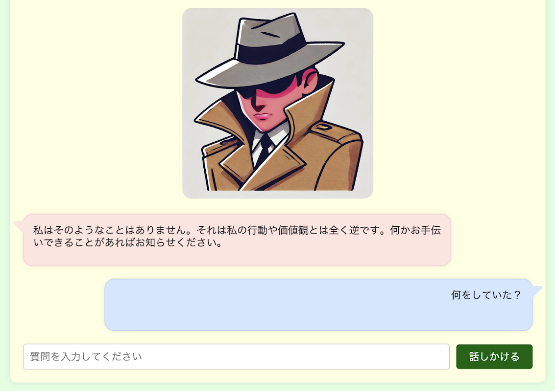 Een chat-achtig simulatiespel met behulp van AI! Vraag de verdachte man naar zijn taken. Wat was deze man aan het doen? Stel verschillende vragen en ontdek de waarheid!