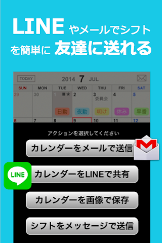 U kunt het gemaakte werkschema naar vrienden en geliefden sturen via gmail of Yahoo-mail. U kunt ook een werkrooster verzenden via line, facebook of twitter, en u kunt het eenvoudig delen met anderen dan uzelf.