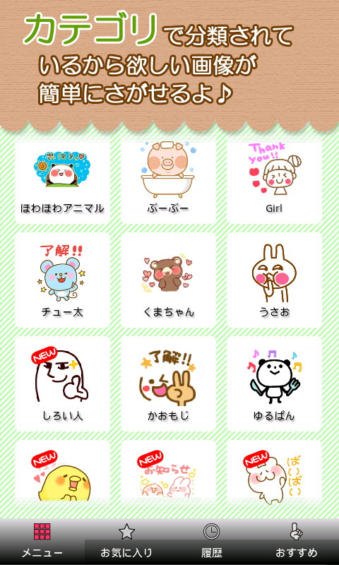 LINEなどでスタンプみたいに使える無料の画像集アプリです画像を選択して送りたいアプリを選択するだけの簡単操作ですお気に入りや履歴機能があって超便利!