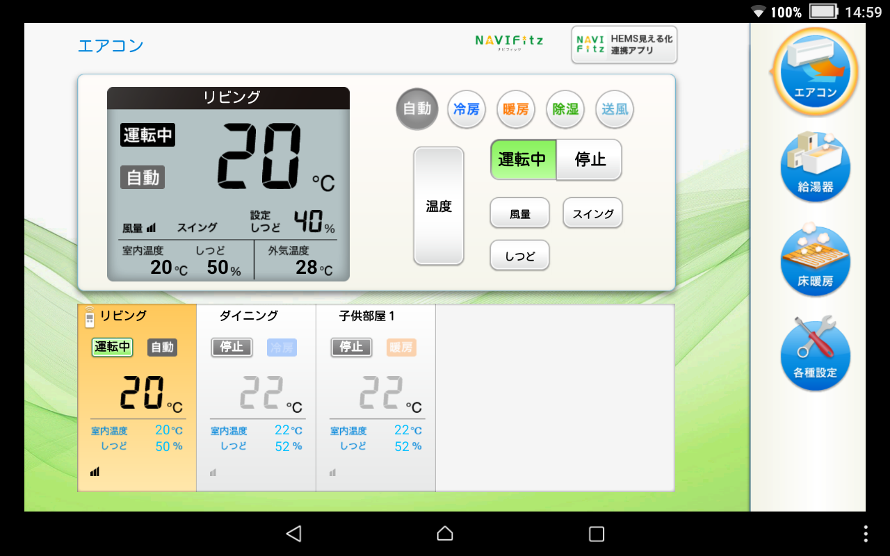 「ナビフィッツ・リモコン」は、お客様宅内のネットワークに接続したナビフィッツモニタを使用し、ECHONET Liteに対応した家電製品の操作が可能です。