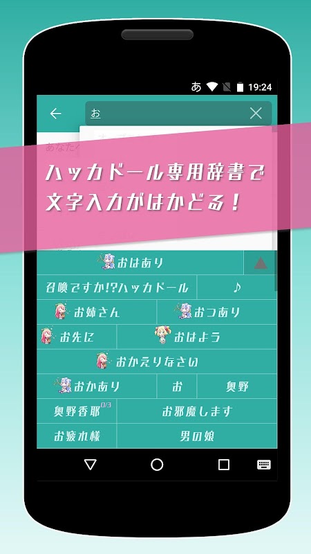キーボードを『ハッカドール』のキャラクター画像で着せ替えすることができます! たくさんのキャラクター画像から気分にあわせてキーボードを着せ替えられますよー!