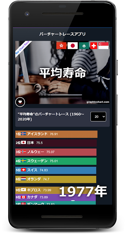 U kunt de bewegende staafdiagramrace met rangorde zien met meer dan 1600 statistieken zoals bevolking, geboortecijfer, levensverwachting, BBP, CO2-uitstoot, werkloosheidspercentage, aantal mobiele telefooncontracten.