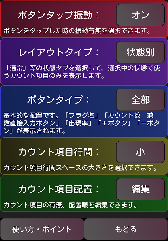 画面下部の「使い方・ポイント」ボタンをタップしてご確認下さい。