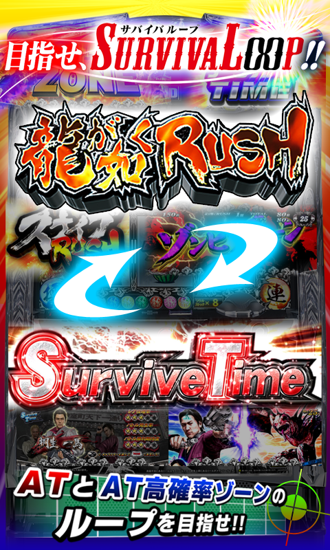 多種多様な機能を搭載した超高性能型AT“龍が如くRUSH”と、AT当選期待度最大99%を誇るAT高確率ゾーン“サバイブタイム”がループする“サバイバループシステム”を搭載!!