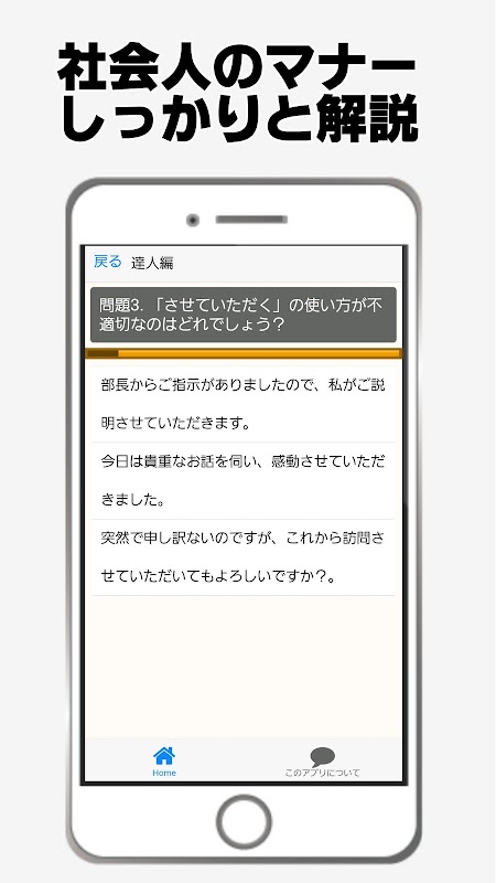 恥をかかないためのビジネスマナー学習アプリです。社会人として重要な知識を厳選して集録しております。新社会人、面接対策や早く昇給されたい方などにもおススメ。