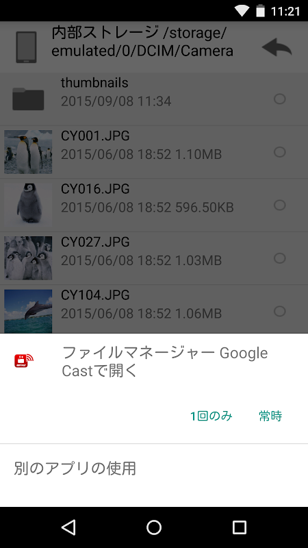 本アプリをインストールすると、「ファイルマネージャー」上で端末やUSBメモリーなどに保存されている写真、ビデオ、音楽ファイルをChromecastやNexusPlayerなどのGoogle Cast対応機器にキャストできるようになります。
