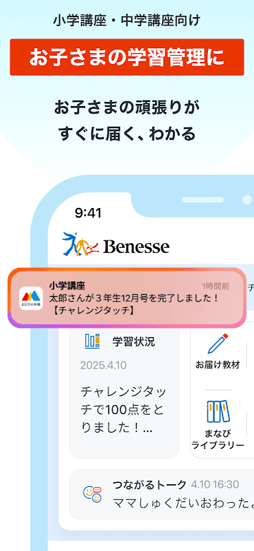 De ouderondersteuningsapp "Learning Notebook" van Benesse biedt op het gewenste moment informatie over de leerstatus en opleiding van uw kind, en ondersteunt tegelijkertijd de Shinkenzemi-inspanningen van uw kind.