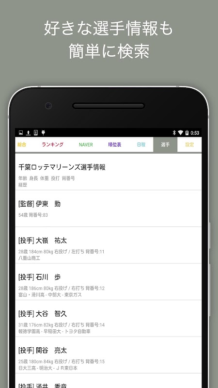 -「選手」ではロッテ所属の選手の詳細情報が知れます。